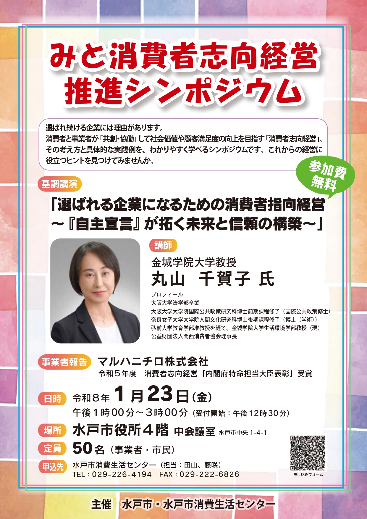 みと消費者志向経営推進シンポジウム開催します 2026年1月7日 参加申し込みURL https://apply.e-tumo.jp/city-mito-ibaraki-u/offer/offerList_detail?tempSeq=79257