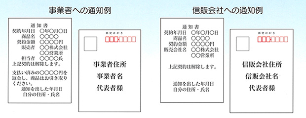 - クレジット契約をした場合は、信販会社にも同時に「契約を解除する」旨を通知します。